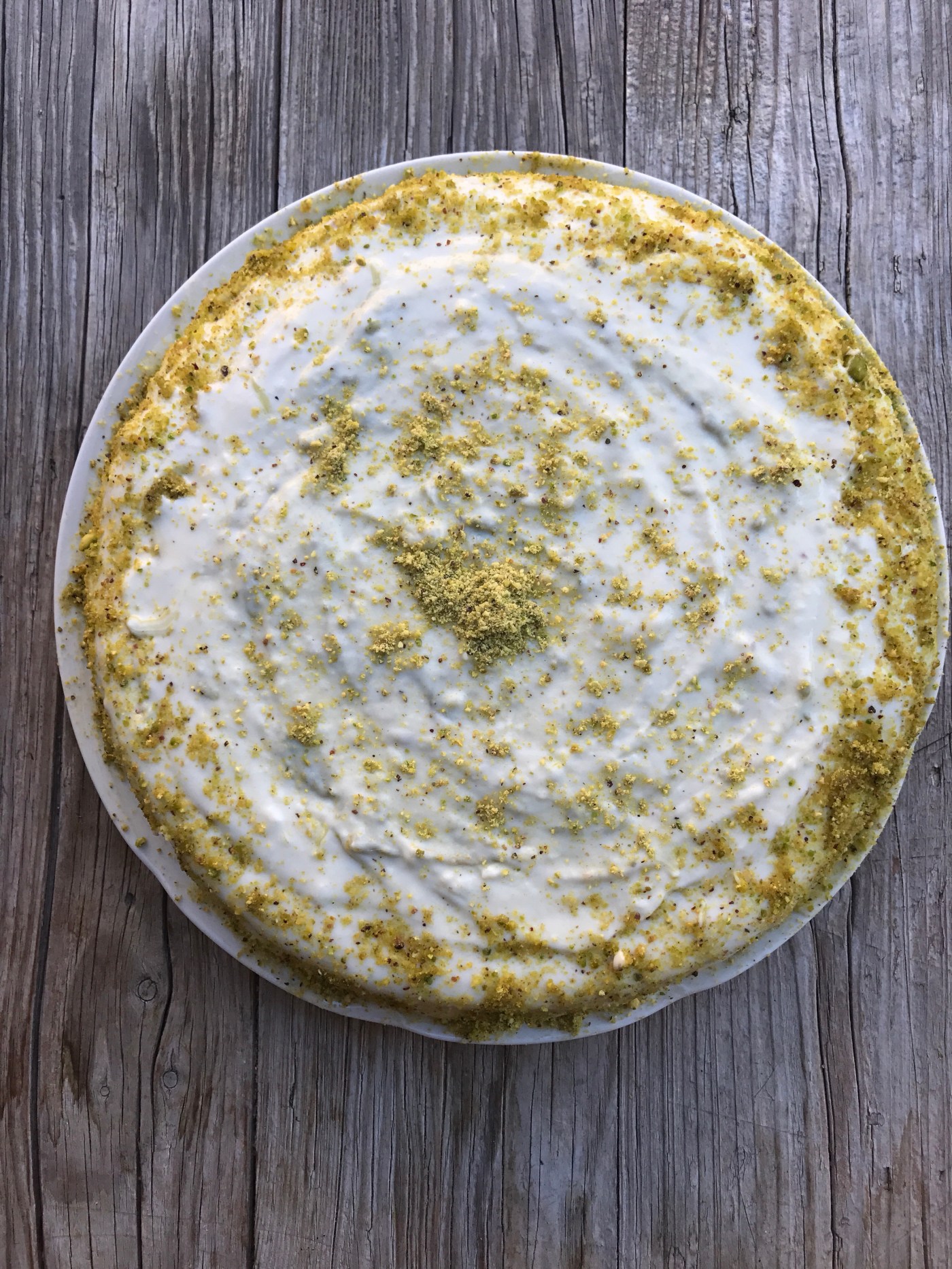 Una volta raffreddata la torta, tagliarla a metà e farcire l’interno con una parte di crema. Usare la restante per ricoprire l’intera torta. Decorare a piacere con dei pistacchi e mettere in frigo.