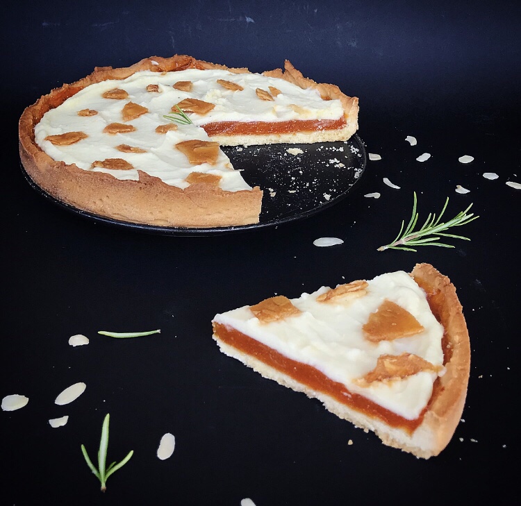 Pensata e studiata nel dettaglio, questa crostata è ricca di profumi, sapori e consistenze che la rendono speciale. Nonostante la sua laboriosità, vale davvero la pena provarla! Una frolla alle mandorle, della marmellata di albicocche al rosmarino, una crema al mascarpone e limone e per finire del croccante di mandorle a lamelle. Eccezionale.
