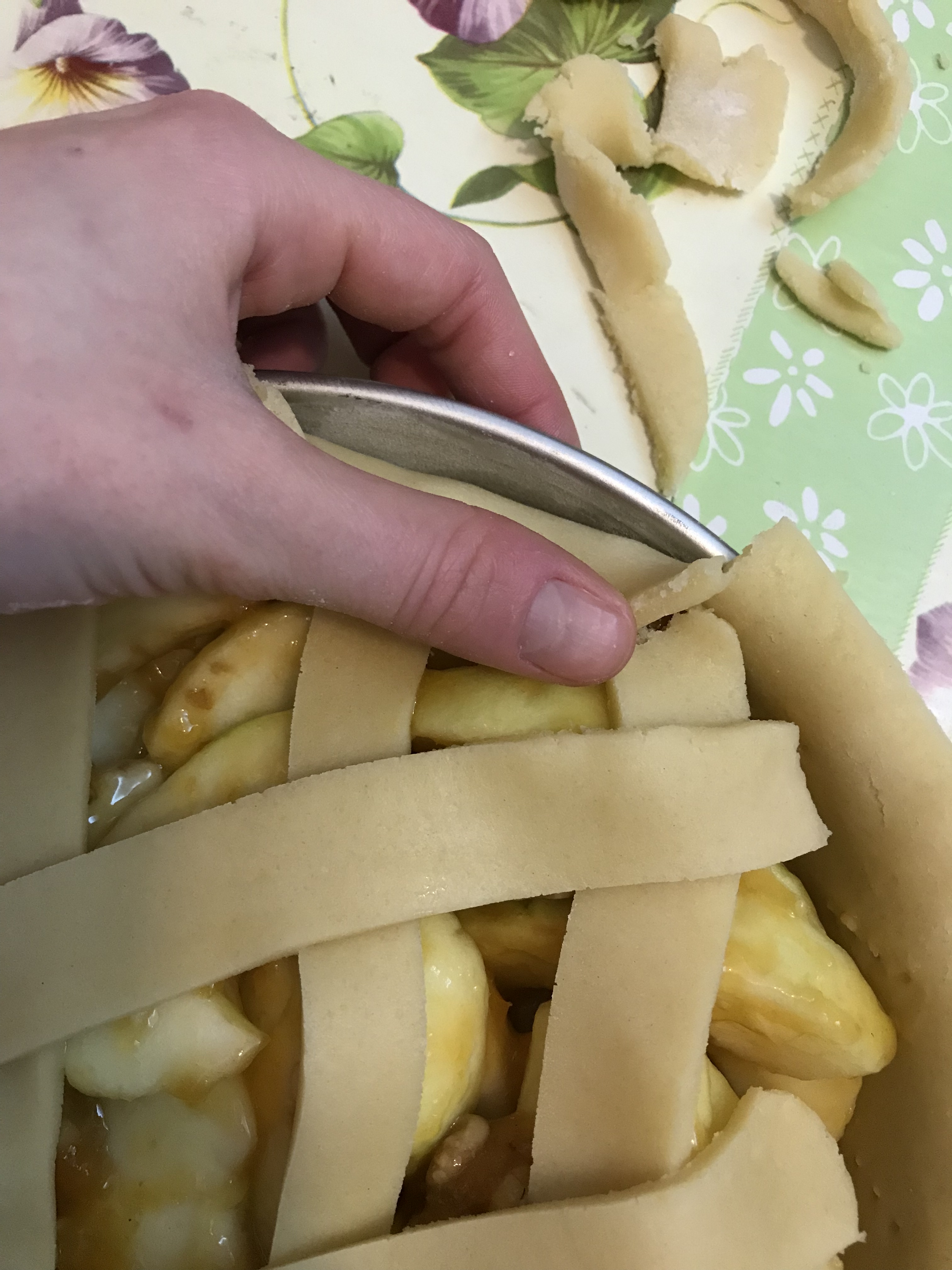 Riprendere la frolla dal frigorifero, stenderla fino ad un’altezza di circa 4 millimetri e ricoprire la tortiera precedentemente imburrata ed infarinata. Bucherellare il fondo con i rebbi di una forchetta e riempire con il ripieno di mele e noci.