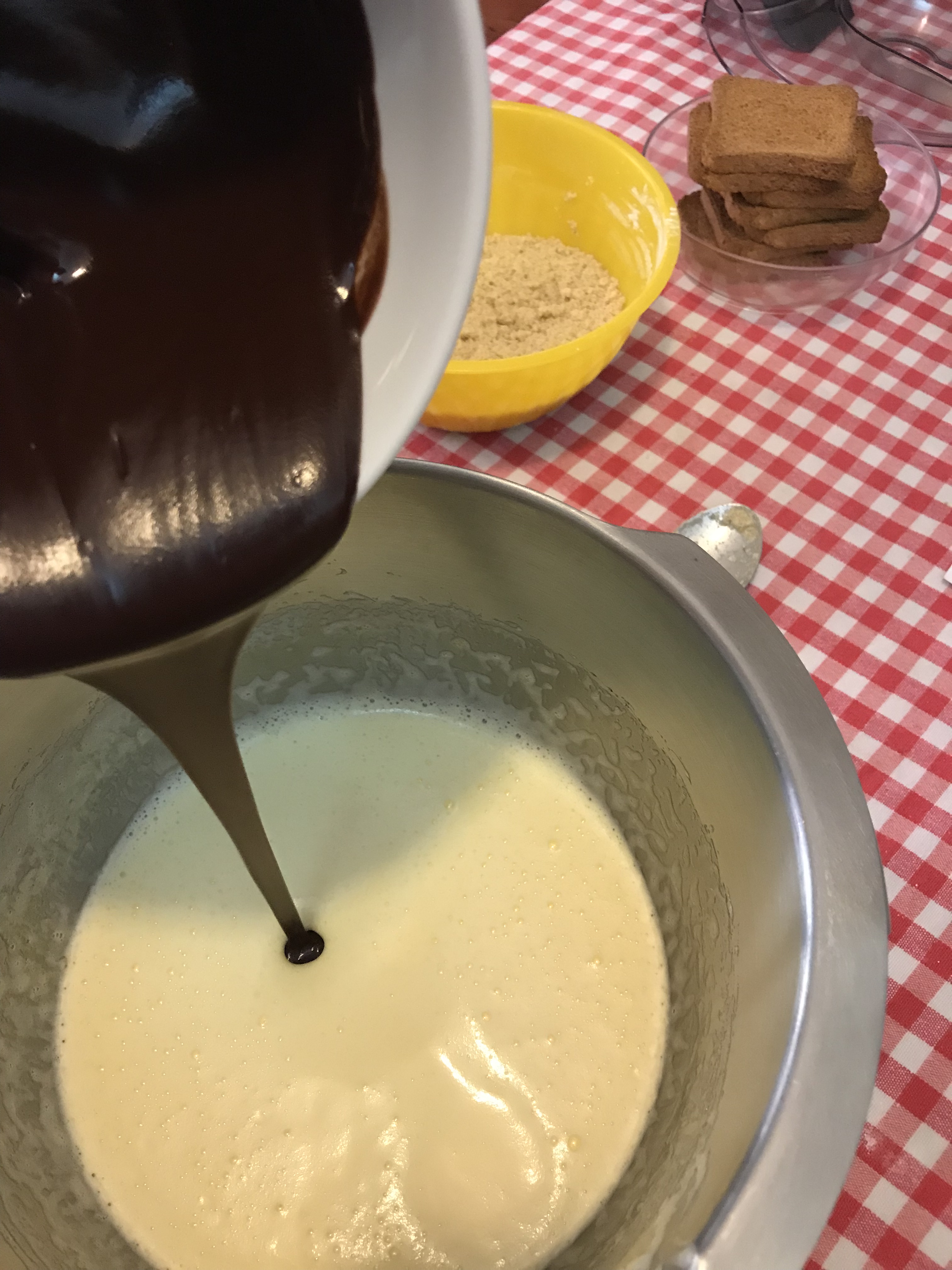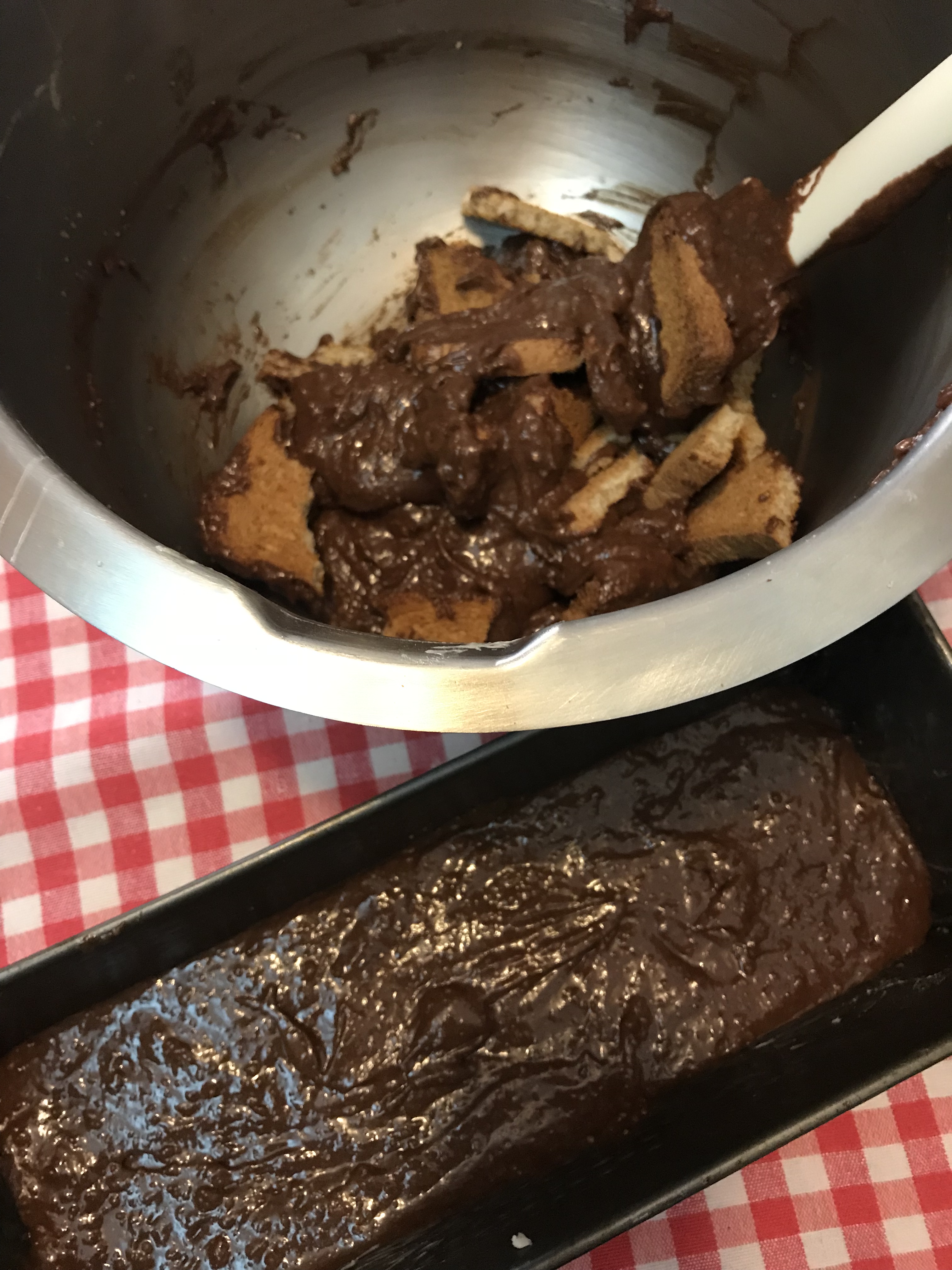Versare i due terzi del composto nello stampo da plumcake. Nel restante impasto aggiungere le fette biscottate spezzate grossolanamente, mescolare e versare nello stampo.