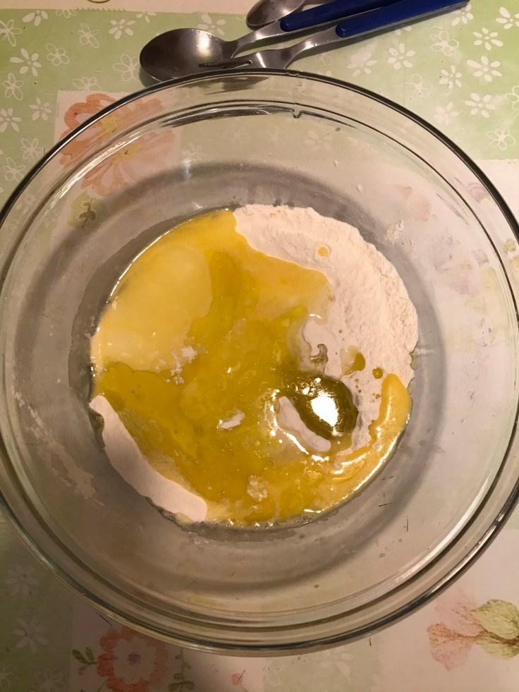Preparare la pasta unendo alla farina il sale, l’uovo leggermente sbattuto, l’olio e l’acqua.