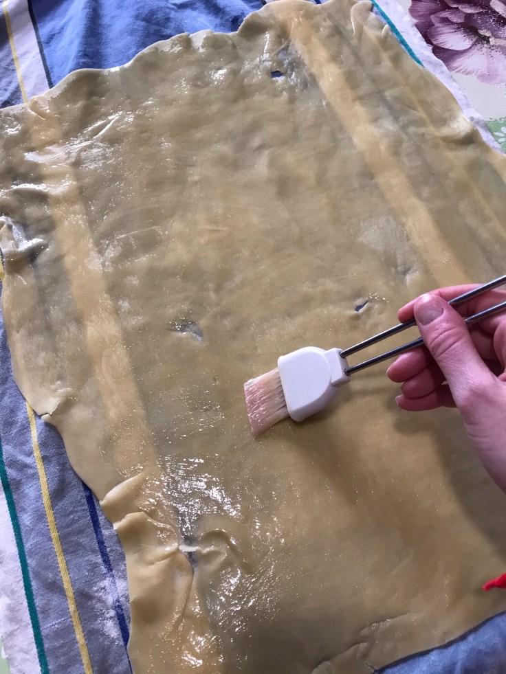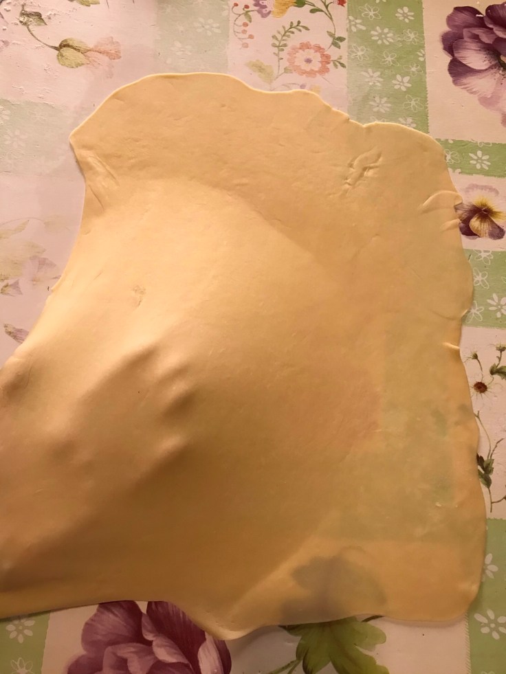 Prendere l’impasto e stenderlo il più finemente possibile. Spostarlo, poi, su di un canovaccio leggermente infarinato e se necessario, tirare ancora un po’ la pasta con l’aiuto delle mani.