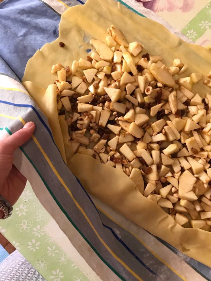 Per il ripieno: tagliare le mele a pezzi non troppo grandi e metterle in una ciotola capiente. Aggiungere il succo di limone (in modo da non farle annerire), la scorza, i pinoli, le nocciole, lo zucchero e la cannella. Mescolare e lasciar da parte.