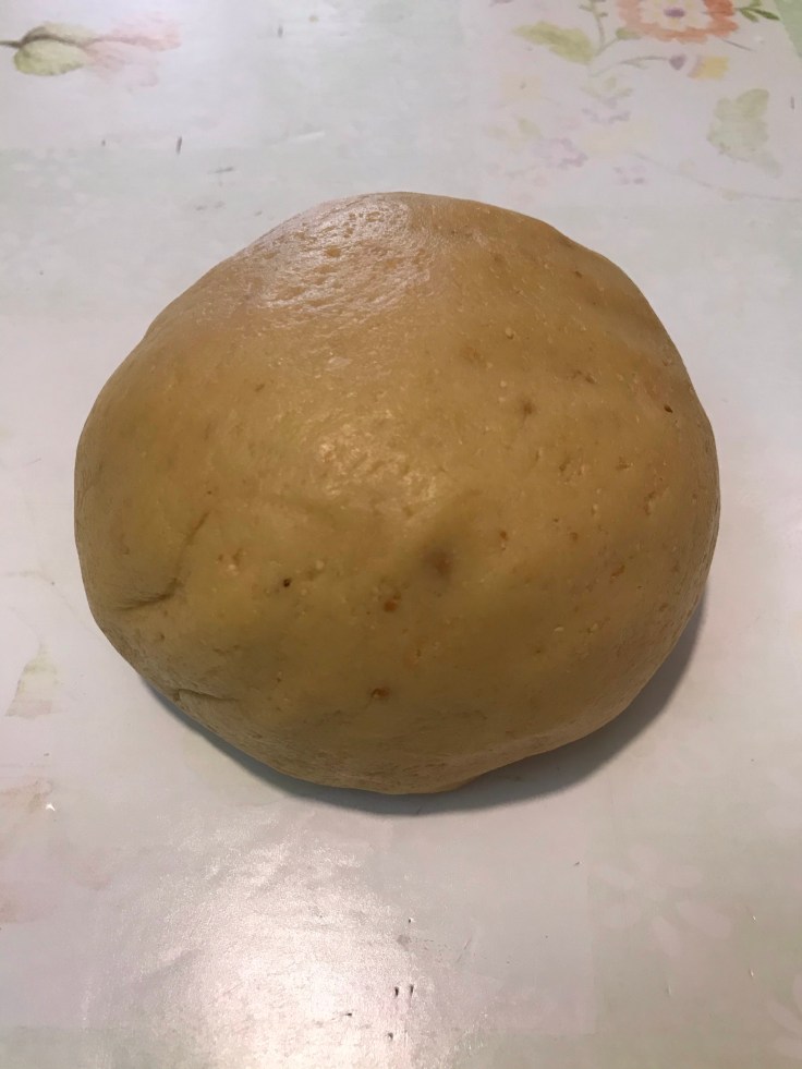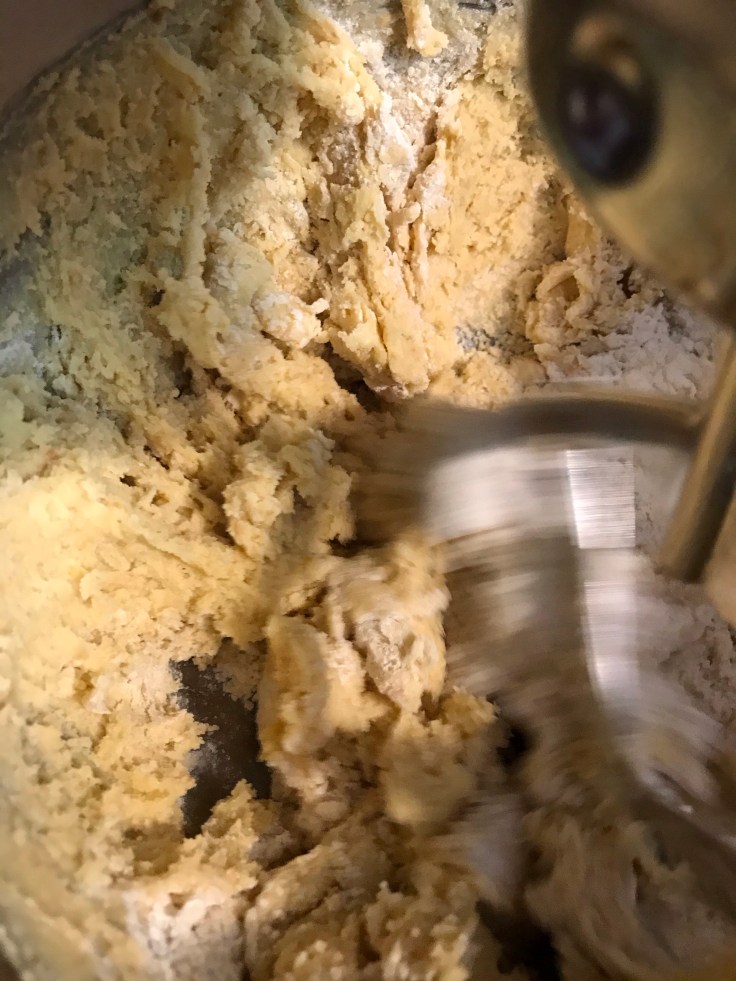 Continuare ad impastare finché tutti gli ingredienti non si saranno amalgamati bene. Trasferire su di una spianatoia e lavorare velocemente a mano. Formare una palla, avvolgerla nella pellicola e lasciarla riposare in frigorifero per almeno 30′.