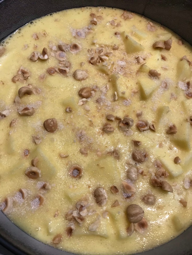 Oliare ed infarinare una tortiera da 24 cm, versare il composto all’interno e cospargere sulla superficie le nocciole tritate e circa tre cucchiai di zucchero semolato.
