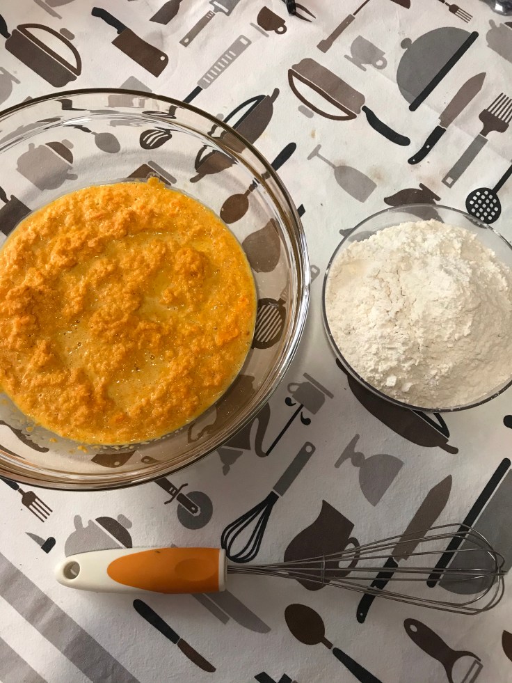 Prendere la ciotola con la crema di carote e a poco a poco unire le farine e zucchero. Mescolare con una frusta fino a che non si sarà amalgamato il tutto.