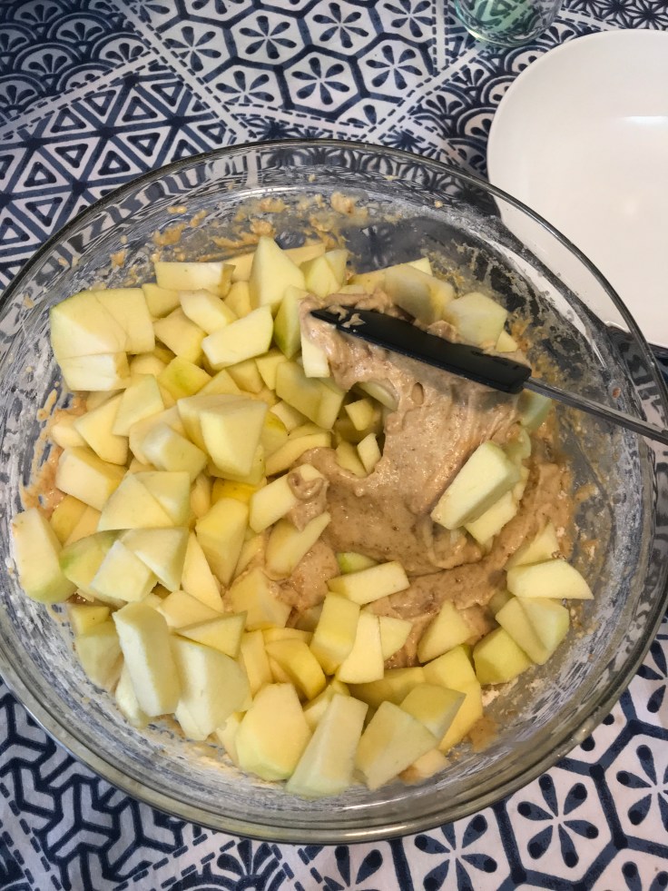 Sbucciate le mele, tagliatele grossolanamente e versatele nel composto. Mescolate con una spatola.