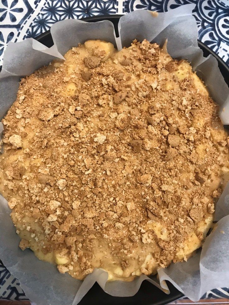 Prendete la tortiera, rivestitela con della carta da forno e versateci all’interno l’impasto. Livellate con la spatola e sbriciolateci sopra gli amaretti che avevate messo da parte.